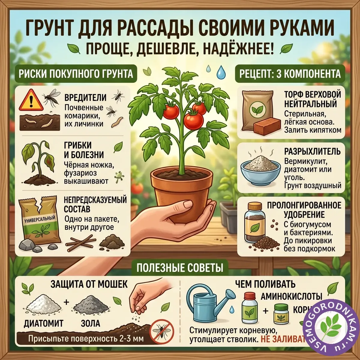 Готовый грунт из магазина — удобно, но рискованно. Я заносила с ним белокрылку, получала ящики с мошками, а однажды вся рассада погибла от грибков из «плодородной» земли. С тех пор составляю грунт для рассады своими руками — это проще, дешевле и надёжнее.